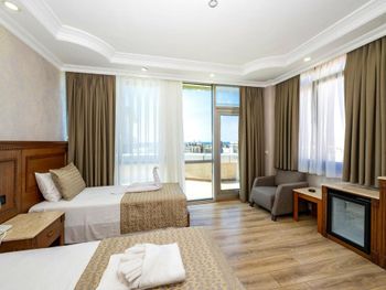 После проживания в этом отеле остались довольно противоречивые эмоции. Для оптовиков покупающих одежду , обувь и прочее... Идеальное размещение кстати. Сотни магазинов в округе, минимаркеты с продуктами и кафе. В 10 мин. пешком набережная Мраморного моря. Три минуты автобусная остановка, 7мин. трамвай где сразу можно купить проездной. В этом же районе обменники с очень хорошим курсом. Теперь об отеле - с -1 этажа сразу можно подняться на лифте, ресепшн на 1м этаже. Метрдотели мужчины, приветливые. Отличное понимание русского языка. Отзывчивые в плане помощи и подсказок. Номера разные, у нас был номер на троих, вид на стену здания. Шкаф для троих, особенно когда вы с зимней одеждой, очень маленький. Матрасы, подушки всё терпимо. Есть чайник, 2 кружки, 2 стакана и мини холодильник. Телевизор с русским каналом и др. В душевой очень не удобно пользоваться душем, представляет собой маленькую Лейку торчащую высоко из стены и льющая воду на стену. Полноценно принять душ довольно сложно, приходится подлазить там же под кран. Убирают ежедневно, так же меняют полотенца. Зимой кстати неплохо грел внутренний кондиционер. Всё бы ничего, если бы не одно НО! Слышимость, это нереально, я думала так не бывает. Слышно буквально, как человек дышит в соседнем номере))) как расчёской расчёсывает волосы и чистит зубы. Об остальных подробностях слышимости я писать не буду)) Если кто то курит в соседнем номере, хоть и курить запрещено, дым будет и у вас в номере. Люди сидя на утренних процедурах в душевой- туалете - курили, а у нас была сигаретное стойкое амбре постоянно. Однажды в номере ночью у нас выбило пробки, потом потек унитаз. Приходилось обращаться за помощью. Так же, ежедневно меняя полотенца и тапочки, нам оставляли всё на двоих, но нас в номере трое. И по вечерам я спускалась на ресепшен и просила третий комплект. Ресторан, находится на 7м этаже. Основной вид на ту же стену здания и наискосок на море вдалеке.