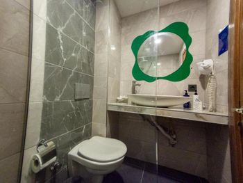 Номера старые, нет многих элементарных косметических принадлежностей типа халат, тапочки, зубная паста и щетка. Были шампунь, лосьон и жидкое мыло. Но бутылки были пустые. Гель для душа был.