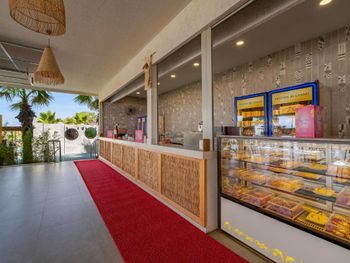 Большие бассейны. Заход в море. Отдельное кафе сладостей. Отдельные зоны без детей. Зелёная территория.