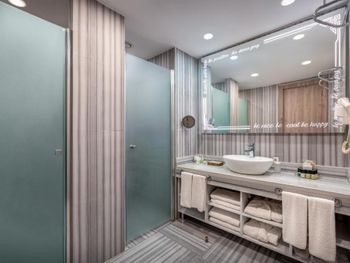 Два момента по сравнению с Делфин Империал - на ужин в основном ресторане чуть меньше ресторанной атмосферы ( скатерти полоски прямо на столы простенькие, уже уставшие не всегда глаженные. Отдает столовой, а не рестораном. И по еде всего много и разнообразно, но рыбы белой мало, в основном сухие сибас, дорадо, скумбрия на гриле, телапии нет, устриц не было, но были пару раз раки, большие креветки. По мясу и всему остальному все более чем хорошо. И второе - номера на мансарде с маленькими ванными комнатами, не критично , но тесновато.