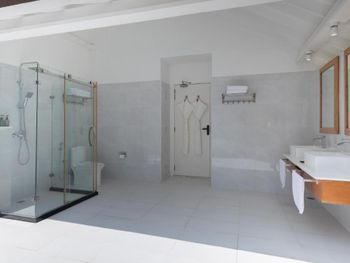 Номер. Ванна, 2 душа. Очень старательные официанты в ресторане.