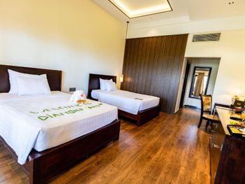 Приезжая в гостиничный комплекс Даймод Бей розорт - спа при готовьтесь к тому что вы платите не за сервис а за антураж: он хорош ,очень красивая территория большой бассейн, правда он с горячей водой аж пальцы разбухают, номера на первый взгляд не плохо но заходя в сан узел такая картина: стульчак на унитазе жёлтый не понятно от старости или от въевшиеся мочи (жесть),швы кафеля серо- жёлтые от воды и плесени,и после принятия душа вода на полу, потому -что стык между ванной и стеной не промазан герметиком, ванна покоцаная ,попой не сядешь ,не приятно,вода плохо уходит даже после посещения сантехника,что касается ресторана : еда вкусная порции хорошие цены раза в три больше чем в городских ресторанах, плюс какая то такса 15%за сервис, но когда принесли чай тут был шок,вода из под крана воняющая хлором,(как будто с бассейна набрали) и пакетик чая Dilma на литровый чайник, с верёвочкой замотаной на ручке ,при этом во Вьетнаме есть плантации чая причем очень вкусного, и это гостиница 5 звёзд ,за те деньги которые платишь должно быть очень чисто ,да и вообще даже номер за 1000 рублей должен быть с чистым сан узлом ,а ресторан с пакетированный чаем должен быть кафешкой или шашлычкой! Понятно что там все расчитано на клиентов по тур путевке, но мы бронировали все сами, и такие пять звезд увидели впервые😬. А, и в магазин , в город вам придется гонять через день, за водичкой и тд, если вы бюджетный турист, то местный ресторан очень дороговат.