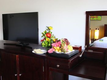 Отель не тянет на 5*, услуги и отношение персонала максимум 3-4*. Еда в ресторанах пресная, готовить не умеют. Даже мой не притязательный в еде муж не смог есть их пиццу в ресторане у бассейна. Меню убогое, выбрать нечего. На завтраке за 3 дня практически не меняется еда, фрукты одинаковые и выбор странный: маракуйя, неспелая папайя, мандарины и драконовый фрукт. Не завидую тем, кто отдыхает там больше 5 дней. Ваучер на скидку в спа оказался просто бумажкой, на услугу, которая нам понравилась, скидка не распространялась. При выезде из отеля просили заказать такси до Нячанга, нам дали машину отеля. Показали адрес, оговорили цену поездки, он завез нас за 2 км от адреса, вымогал еще денег за правильную доставку. Правда, не повезло ему с нами... Вообще в этом отеле водители электрокаров чувствуют себя хозяевами, издеваются над гостями. Хочу-повезу, не хочу-поедете на узкой планке сзади авто. Поменять пора управляющего отелем. По территории на электрокарах ездит только персонал, гостей даже с тяжелыми пакетами после поездок в город к месту проживания подвозить не желают. Только при заселении и выселении , если позвоните сами. В номере есть информация об отеле, но такая, что не нужна в принципе. Зато информации про часы работы бассейна, как получить и сдать пляжные полотенца, где стоянка электрокаров на пляж нет. Информация, полученная при заселении, была несколько неверной, пришлось уточнять. Короче, беда с персоналом и управлением.