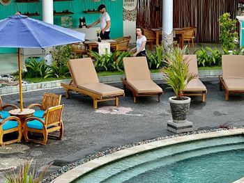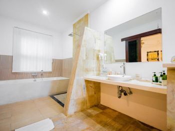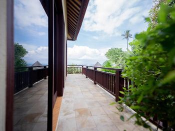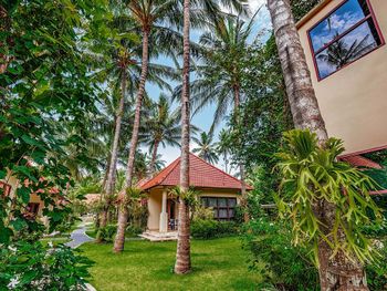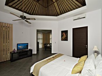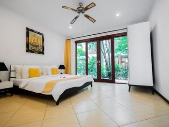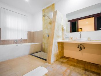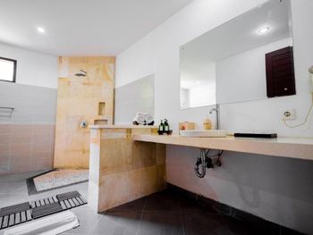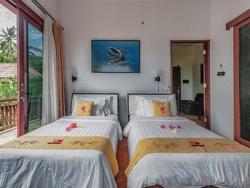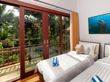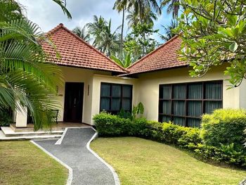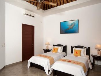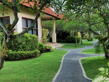 Персонал невнимательный. Предложили вариант альтернативного размещения, но не учли пожелание о раздельных кроватях, а когда им на это указали, то нам сказали, что кровать поменять нельзя и обратно отыграть спустя 20 минут уже слишком поздно, так как они умудрились успеть отдать наши номера другим... Как вам такое отношение? Доп. одеяло принесли только с третьей попытки. Узкие петляющие дорожки на территории отеля имею крутые края вровень с шапкой газона, так что случайно наступив на край дорожки пожилой человек гарантировано либо подворачивает ногу либо в добавок ныряет носом в газон (наш случай). Отель видавший виды. Бельё после смены всё в жёлтых разводах. Вход в море очень стремный, кроме нас никто не купался. В отлив мелко, по время отлива купаться запрещено, а в прилив - вода бурлит. Рыбок не видно. До ближайшего пляжа White Sand (Virgin) Beach вас отвезут за драконовские 310 000 рупий, за столько же и местные барыги. Нормальное такси Grab в разы дешевле, но его к отелю не подпускают. В нашей вилле были опасные лестницы на второй этаж без перил c узкой верхней площадкой (разворачиваясь от двери можно нырнуть). Спуск голыми ногами по мокрой гладкой каменной лестнице привел к болезненному падению (нет перил). Чудом удалось избежать серьезных калечущих травм. Плюс на втором этаже был участок с полностью сгнившим ограждением. Отель бы никогда не прошел современную сертификацию на безопасность.