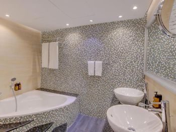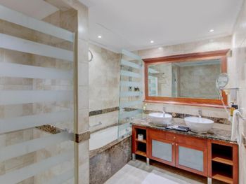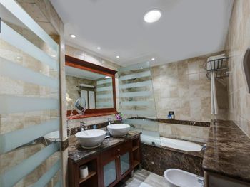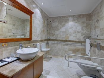 Белье постельное и полотенца серые. Кровать неудобная. Вода в душе была чуть теплая, там еще была джакузи, из которой по каменным плиткам выходить сложно, вообще зачем она нужна, лучше бы был хороший душ в кабине. А в умывальниках вода была горячей. В номере пахло куревом. Был балкон, но он был закрыт на ключ, окна тоже, хотя можно было бы проветривать, погода позволяла. На ресепшен обслуживали долго. Завтрак … ну перекусили, минимальный за 60 дирхам с человека.