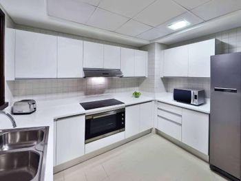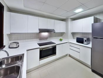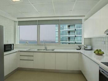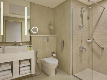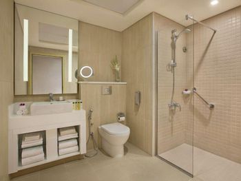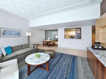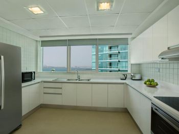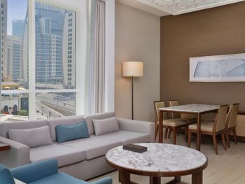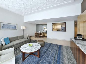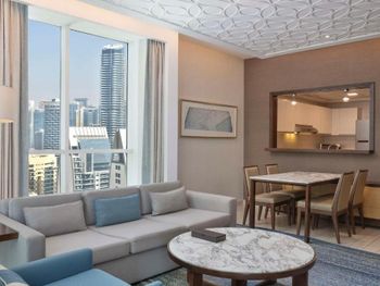 Нас тепло приняли, угостили печеньем, объяснили про порядок заселения, поздний выезд, депозит (2000 дирхам, можно оплатить картой, наличными или долларами по местному курсу). Стоимость позднего заселения вычли из депозита при выселении, остаток вернули - очень удобно. Заселили чуть раньше намеченного времени и сделали апгрейд - дали номер с видом на колесо вместо вида на город. Вид на город - это Марина в сторону Джебель Али. Большое спасибо персоналу за вид с балкона! Но рядом соседняя башня, где живут люди, для приватности лучше зашториваться и самим соблюдать правила приличия. Просторные апартаменты - 2 спальни, гостиная, 3 санузла, кухня и балкон. Мы остановились семьей из 5 человек и места хватило всем. Наличие стиральной машины, холодильника с морозилкой, моющих средств и посуды на кухне - это очень удобно для отдыха с детьми, можно было застирать запачканную одежду. Кухня полноценная, можно готовить. Раздевалка с душевыми и туалетами на улице рядом с бассейнами - спасение, очень удобно после пляжа, чтобы не нести песок в номер. В номере убирают хорошо, хром блестит, приятно пахнет, нет едкого лимонного запаха как бывает распыляют в местных гостиницах. Персонал приветливый. Хилтон держит свой стандарт. Благодарю весь персонал за оказанный прием, помощь, тепло и заботу!