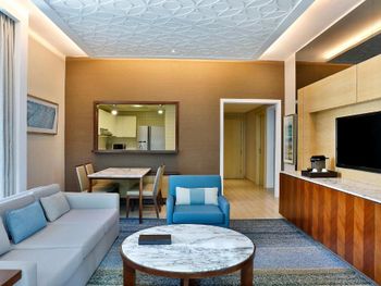 Нам был бесплатно сделан апгрейд - вместо номера с 1-ой спальней был предоставлен с 2-мя спальнями и большой гостиной. Выражаем за это благодарность менеджеру отеля Рите). Номер очень просторный, в нем есть все необходимое. На завтраках достойный выбор блюд, столики в зале и на улице. Отличный бассейн и небольшой выделенный пляж, много свободных лежаков