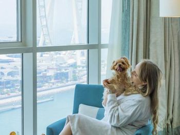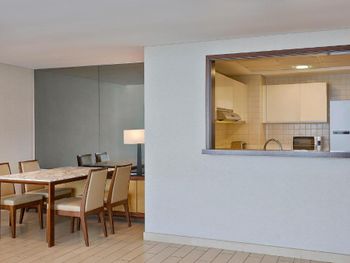 Номер, к слову, прекрасный. Из окон открывается вид на колесо обозрения. Это большие и просторные апартаменты, идеально подойдет для отдыха большой семьи. Есть кухня, гостиная и столовая зона.