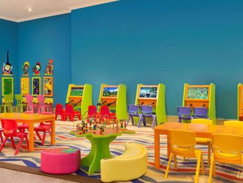 Концепт отеля семейный отдых, детская комната, анимация, водные горки и бассейн