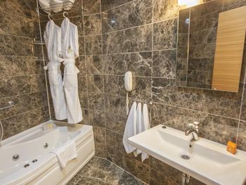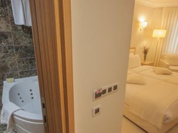 Номер явно не 60м^2, как было заявлено, но, в принципе, просторный, особенно в сравнении с остальными. С дома мы привезли кучу соли , пены и тд., ведь нас ждала роскошная ванна- джакузи. Но, снова разочарование, так как эта ванна - джакузи скорее была ее миниатюрной копией, того, что было на фото. Туда смело бы поместился человек , не больше метра в длину.