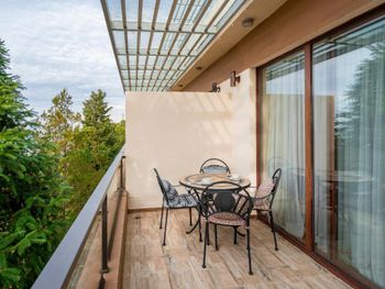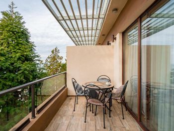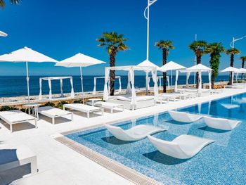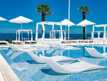 расположен на берегу моря , зеленая територия , есть аквапарк , хороший грузинский ресторан , большие номера люкс с просторным балконом видом на море