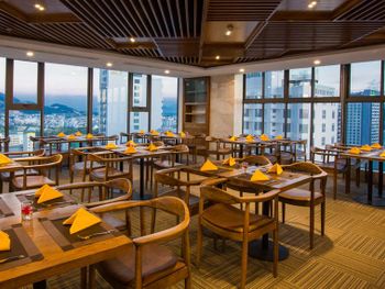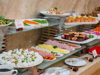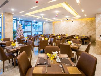 Завтрак относительно разнообразный: яйца разных видов, фо бо, разные виды горячего, такие как макароны, картофель, мясо; свежие овощи и фрукты, хлопья, выпечка; в отличие от других наших отелей во Вьетнаме, здесь даже были плавленный сыр, ветчина, паштет и панкейки (правда, холодные) каждый день. Кофе неплохой, чай никакой — один пакетик на большой чайник.