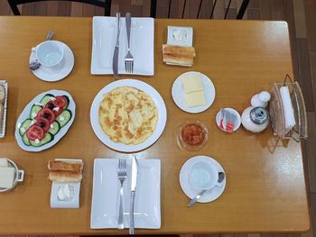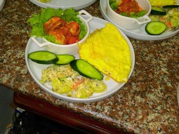 Завтрак на двоих (фото с 2 дней прилагается). Во второй половине отдыха порции слегка увеличились: добавили по одному мини-кексу из магазина. Один раз дали овощное рагу. Всё разнообразие на протяжении 11 дней заключалось лишь в способе приготовления яиц: омлет/глазунья, колбаса нарезкой/обжаренная.