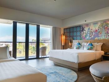 Доброжелательный персонал, как и везде на Бали. Чистые комнаты, отличная уборка, красивые фигуры из полотенец. Большой выбор на завтраках, подземная парковка для автомобилей, расположение на улице с массажами и большим выбором кафе.