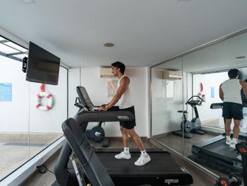 Неплохие завтраки, правда хотелось бы фруктов побольше. Море относительно недалеко, но если хочешь покупаться где почище, то еще нужно идти вдоль берега направо, если лицом к морю, и это занимает около 30 мин. туда, и столько же обратно. Спортзал - одно название! Метр на метр! Тесно, тренажеров особо нет, беговая дорожка, велосипед и гантели, и все.