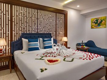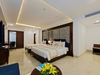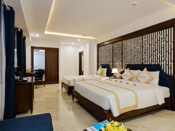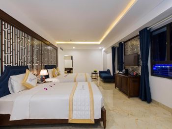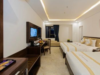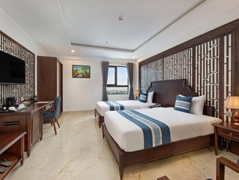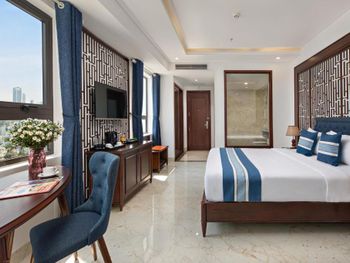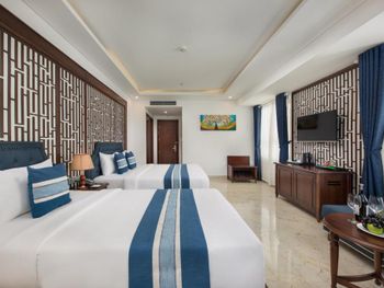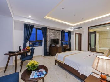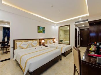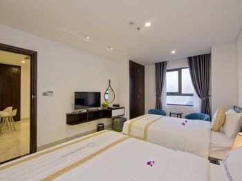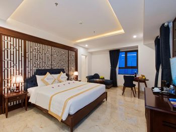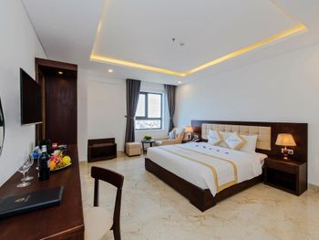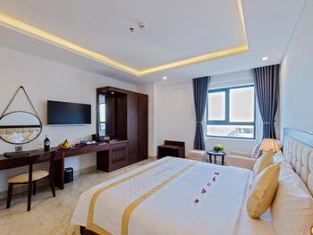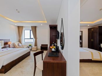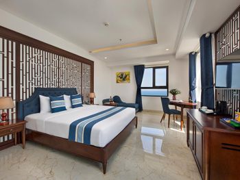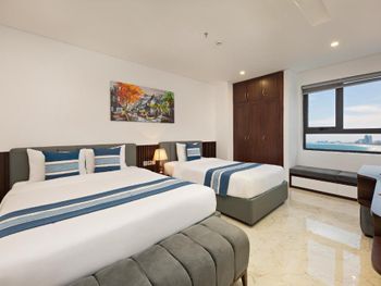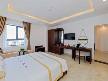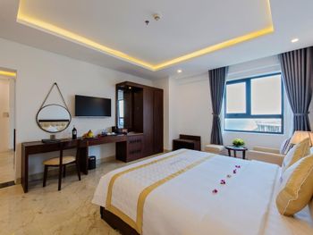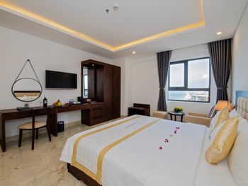 Расположение у отеля отличное, первая береговая линия и наверное самая красивая часть пляжа Да Нанга, рядом райончик, где много кафе, ресторанчиков, магазинов, спа-салонов. Завтрак в отеле отличный, много всего на выбор, свежие фрукты, манго, арбузы и то, что есть сгущенка меня покорило) Персонал отеля пошел нам на встречу, когда мы не смогли улететь из-за визы вовремя, а номер уже был полностью проплачен и мы попросили перенести даты заезда на неделю, пока не решим вопрос с визой и они вошли в наше положение, а при заселение еще и дали нам двухкомнатный номер, хотя мы бронировали стандартный! Отель новый, полотенца свежайшие, персонал очень дружелюбный.