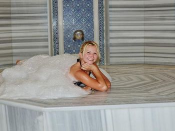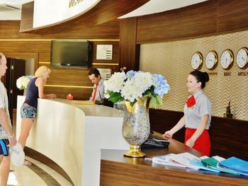 Бесплатный wi-fi ужасного качества, даже на ресепшене. Хорошо нам было в отеле только первые 2 дня (из 5). В 1ю очередь потому что нас поселили на ту сторону, куда выходят кухни нашего и соседнего отеля и территория соседнего отеля. Утром не позднее 7-30 под окнами начинался грохот — разгружались машины с едой, звенели ложки-вилки, шум-гам, а вечером в соседнем отеле громыхала дискотека до 1-2ч ночи. Днем тоже отдохнуть в номере невозможно — уборка, как нам сказали на ресепшене, с 12ч до 16ч. 1 раз пришли убирать в 15-40, мы хотели поспать после уборки и поспать из-за этого удалось только 30-40 мин, чтобы успеть на мороженое. И в день отьезда уборщицы пришли в 10-30. Какая логика непонятно, если выезд в 12ч? Когда мы сказали об этом на ресепшене администратор не извинилась даже. И даже туалетная бумага в этом отеле (некоторые рулоны) пахли неприятно (туалетом). В хаммаме потолок с грибком. Мороженого не хватало, в лучшем случае оставался 1 вид мороженого из 3х, за 30-40 мин оно заканчивалось, хотя должно было подаваться в течение часа. Еда однотипная, хотя и большого ассортимента, но в последние 2 дня жена уже не могла ее есть. На пляже запах еды из соседних отелей — неприятно. Жена сказала, что повторно в этот отель не поедет ни за что.