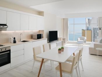 Огромный номер - 2 комнаты и 2 сан узла! Для меня важно было иметь стиральную машинку и кухню - все было! Правда сушить постиранную одежде не на чем. В целом, все чистое, матрас мягкий, белье и полотенца меняют каждый день, посуду моют)). Кондиционеры в каждой комнате отдельно регулируются. Есть отличный фитнес зал (работает круглосуточно!), небольшой бассейн, сауна - все входит в стоимость проживания. Чудесный приветливый персонал! Есть разные розетки (не во всех отелях есть)