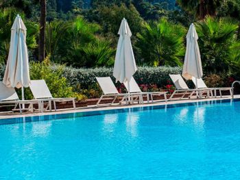 Меленькая территория отеля, шезлонгов у бассейна не хватает.