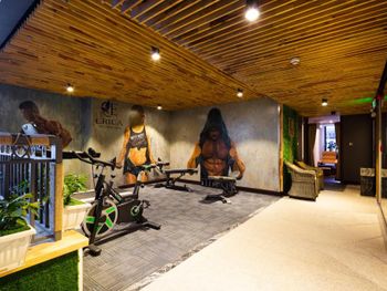 Спортзал находится в зоне на открытом воздухе, поэтому там жара.