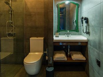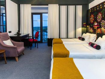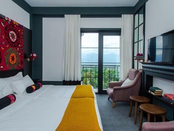 Много негатива вызвал отель, но постараюсь привести сухие факты, без эмоций: 1. Расположение. У отеля 5* должна быть соответствующая компания вокруг, но отель находится на окраине Телави, среди частного сектора. Никаких прогулок по соседним улочкам, похода в рестораны рядом. 2. Вид из номеров. Только одна сторона отеля обращена к горам, из остальных номеров будет вид очень нелицеприятный - полузаброшенные дома, сломанная детская площадка, мусорка. Про номер: 3. Сомнения в наличии стандартов уборки номеров. В день заезда обнаружил ёршик без ручки и засор в душевой. Как это не могли заметить при уборке номера после предыдущих гостей? Значит они не убирают как минимум эти зоны. Пока жили в номере поняли что туалет точно не убирают. 4. При открытии и закрытии двери система издавала громкий 5 секундный сигнал. Персонал сказал это ок. Но мы были с ребенком, а значит если он спит кто-то из нас не мог войти/выйти из комнаты. В итоге отель отключил эл.ключ и выдал нам обычный. 5. В номере только кофеварка, нет чайника. 2 дня из 4 персонал забывал ставить новую воду и капсулы для кофемашины. 6. Ковролин и стены в ванной в пятнах. 7. Нет блекаут штор. Общее: 8. Бассейн не чистят, на дне лежала грязь все дни проживания. 9. Официанты не расторопны, посуду не убирают. 10. Завтрак не соответствует 5*, очень скудный. 11. Были на машине, каждый раз при въезде надо было объяснять охранникам (не говорили на иностранных языках), что мы тут живём, хотя можно было бы переписать номера машин постояльцев.