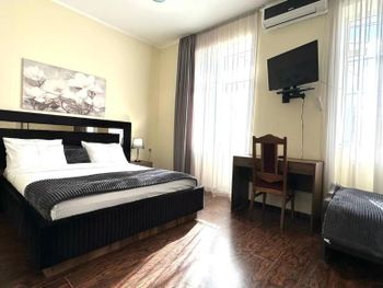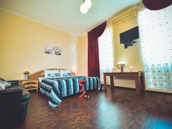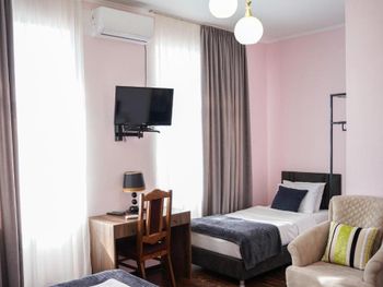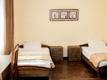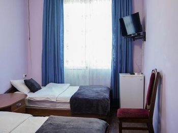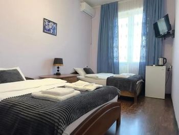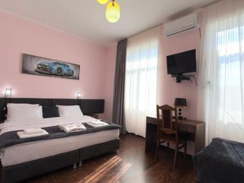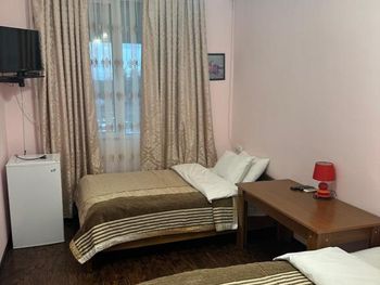Это отличный вариант, если вам нужно отдохнуть между пересадками или если прилетаете ночью, так кпк отель рядом с аэропортом, плюс есть бесплатный трансфер в одну сторону. Мы немного промахнулись по времени и заселились в обед, что было неудобно, так как пришлось ехать в город, а это пол часа в одну сторону и 17 лари за такси. Если приезжаете днем, лучше выбрать вариант именно в городе. Сам номер небольшой, но чистый, удобная кровать, хорошее постельное белье. Душ, как и в большинстве номеров Грузии в туалете-просто лейка и слив в кафеле, но сполоснуться пойдет. Рядом нет никаких магазинов, но в самом отеле вроде как есть ресторанчик. Мы заехали в воскресенье, он не работал. Изначально в номере было холодно - скорее всего, потому что вход в отель - стеклянная дверь, которая постоянно открывается, но нам поставили два больших нагревателя плюс включили кондиционер на теплый обдув. Администратор очень приятный молодой парень, все объяснил, был крайне внимателен и доброжелателен. Говорит по английски, но немного понимает по русски. С виду отель старенький, сначала немного напугала вывеска "Казино", но ночь прошла отлично, никто не шумел, при том, что слышимость максимальная - стены очень тонкие и когда кто-то ходит мимо это слышно. На мой взгляд цена дороговата за ночь, но в целом нареканий нет, успехов хозяевам и администрации!