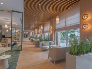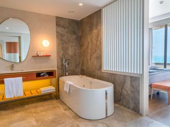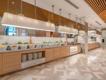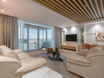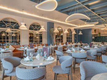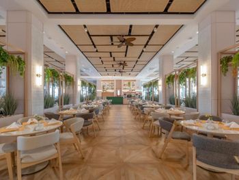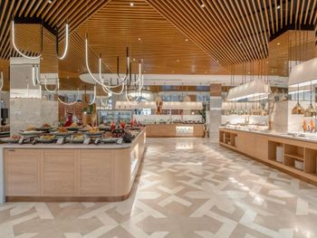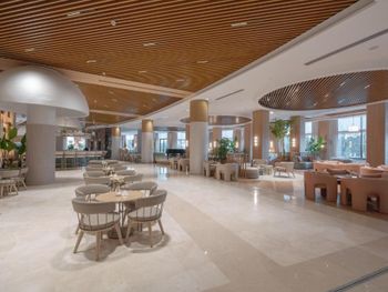 Очень красивый холл: высоченный потолок, грандиозные люстры (только одна горит), вид из лифта, как и из окон, - вдохновляет. Здесь работает гениальный садовник-дизайнер - такие чудесные деревья, лужайки, поляны - радость для глаз! Радушные, гостеприимные сотрудники, прекрасно говорят на русском, во всём помогают. Спасибо! Приятный, очень удобный ресторан: вся еда предлагается по кругу, на всё можно указать пальчиками, повара друг другу помогают, очередей на возникает. В еде, конечно, уже на второй день хочется разнообразия, но это следствие пандемии. Везде скудный выбор. Бассейн холодный. Наш трёхлетний малыш сразу замёрз, несмотря на активность, годовалого мы даже не рискнули отпускать. А ведь сауна, хамам и душ не работают. Отогревали пацана в ванной в номере. Детские площадки, мини-клубы на ремонте, детской анимации, как и детского питания, нет вообще никакой. Зато здесь шикарный песочный пляж - самый широкий из всех, что мы видели. Чистый!