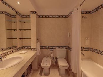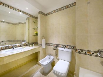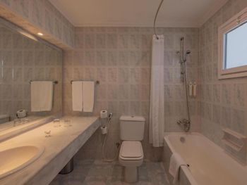 Что касается номера в отеле - мебель, конечно, уже старая, но в целом не разваливается))) номер был светлый, очень большие окна - во всю стену и маленькая терраса со столиком и креслами, как обычно, в таких отелях… размер номера нормальный, не маленький… Есть электрический чайник, кладут чай в пакетиках, кофе, сахарно, есть нормальные приборы… Что касается ванной комнаты - конечно, реально требует ремонта, очень старая ванная, периодически плохо проходит вода, кафель в ванной, чуть ли не как у нас в советское время… Убирали в номере хорошо, но мы оставляли чаевые.