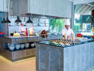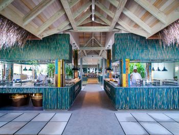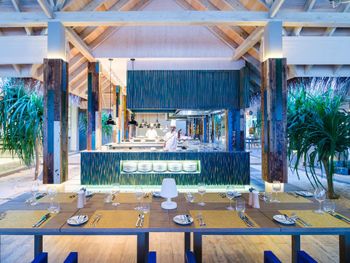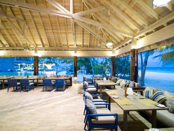 Очень, очень большой остров. Прям такой маленький вариант турецкого отеля. Много развлечений, много детей, много персонала. Приличные общие бассейны. Отель очень понравился, виллы на воде вообще шикарны, новые и просторные. Базовый all-inclusive очень хорош, много алкоголя и коктейлей. Если брать повышенный уровень то будут taittinger наливать бесплатно. Рестораны, конечно, не мишлен, но голодными не оставят. Есть кальян. Раз в неделю был устричный бар.