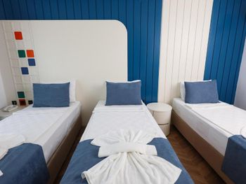 Новый компактный отель, приятная и красивая зона у бассейна с плавучими лежаками, все как на фото. Персонал всегда готов помочь. До моря 10-15 мин пешком, прекрасный лес по дороге, свои лежаки на городском пляже (выдает дядюшка Али). Неплохое белое вино в баре у бассейна. Места у бассейна всегда есть, хотя их наши соотечественники так и продолжают занимать с раннего утра, оставив полотенца и уходя по своим делам, в том числе на пляж. Пляжные полотенца выдают, полотенец в номере достаточно. Наверное, для 3* питание норма - 2 горячих (курица и курица или курица и говядина), морепродуктов/рыбы не было ни разу. 3 гарнира. 1 суп. Салаты/закуски. 2 вида пирожных (пахлава была 2 раза, тут же разбирали, новую не доносили). Из фруктов - только арбуз, на завтрак, обед и ужин. Всё. Чай/кофе/какао круглосуточно. Если привыкли к 5*, кушайте в ресторанах. Вода в море потрясающая. Утром море чистое и без волн. Рядом корнер с водными развлечениями. Но ценник дороже Дубая в два раза.