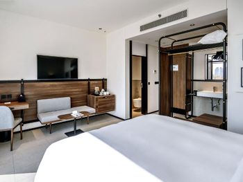 2) номер маленький и крайне НЕУДОБНЫЙ! очень тугие двери в ванную, это просто кошмар! открывать приходится с усилием, закрываются с таким стуком, что если вам надо тихо - это не получится! отель позиционирует себя как дизайнерский, но такому дизайнеру надо оторвать руки. Все очень неудобно по эргономике, в ванной не развернуться, не повернуться, в номере крошечные стол и диван, один стул,,, вещи приходится наваливать на диван. В шкафу было три вешалки, чтобы принесли больше, пришлось звонить и идти лично на ресепшн - персоналу реально фиолетово на просьбы своих гостей. Да, и еще - окна крайне маленькие в номере - чувствуешь себя как в камере, штор нет (окно завешивается белым экраном), вид на стройку угнетает.