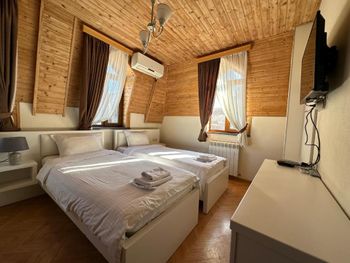 Завтрак. Проходит в подвале. Для тех кто привык к шведскому столу, брать проживание с завтраком не советую. Во первых накануне вечером просят точно сообщать на ресепшн время, в которое вы хотите придти на завтрак . Во время отпуска это не очень удобно. (это удобно только для персонала и хозяев отеля). В первый день пришли во время, нам дали тарелку плова на троих (плов с курицей на завтрак, скажем так не самое лучшее решение), салат из моркови, хлеб, масло, омлет, кекс, немного творога .Кофе на столе только растворимый,чай в пакетиках. Пришлось просить, чтобы сварили по- турецки. Ушли полуголодные. Во второй день в назначенное время подали хинкали с мясом ( вкусно, но это еда не для завтрака) , салат, омлет. В общем формат завтрака этого отеля совсем не понравился. Балкона в номере нет.