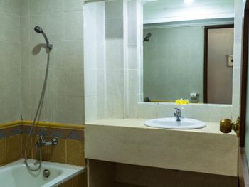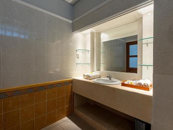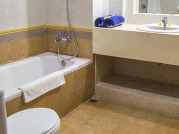 Ванная. Пусть не белоснежная и воды горячей хватило не на долго, но я все же рад! Все работало! Вид с террасы достался нелучший, но сама терраса огромная. В бассейне поплавать не нашел времени, но с ним тоже все хорошо. Чисто везде, если не придираться к высоким шкафам) а кровать... Комфортнее я давно не встречал. Рекомендую!