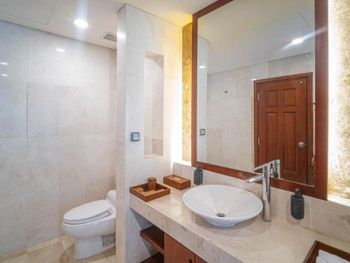 The elegant marble bathrooms offer separate rain showers and premium amenities for ultimate comfort.