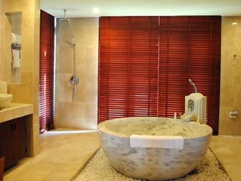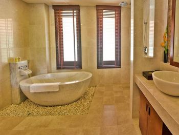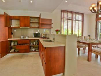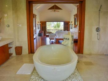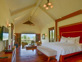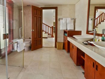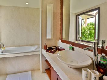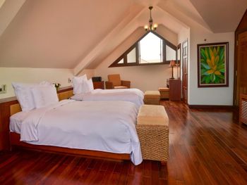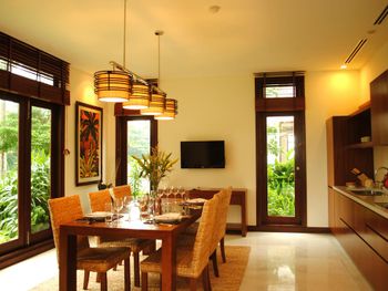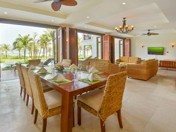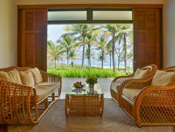 Offering pool or ocean views, each double-storey villa comes with living and dining areas. A well-equipped kitchen includes a stove, minibar and microwave.