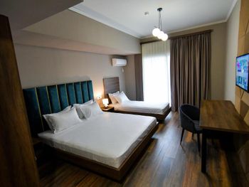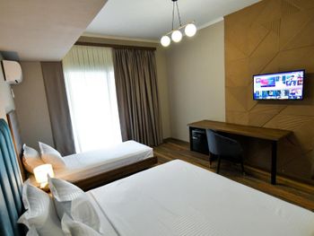 Отель новый, не маленький. Есть своя ухоженная территория. Находится действительно не далеко от центра. Красивая входная группа и ресепшен. Красивые коридоры. Положительный момент, что в отеле предусмотрен завтрак. В последнюю ночь нашего проживания на ресепшен была русскоговорящая девушка) Нам нужно было ехать в аэропорт ночью. Она нас разбудила вовремя, трансфер тоже был хорошо организован. На этом плюсы заканчиваются.
