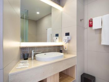 - странная конструкция ванной комнаты: одна стеклянная дверь, которая не доходит на добрых 10 см до пола и до потолка. Соответственно вода заливает весь пол в ванной комнате. Эта дверь используется одновременно как входная в ванную и закрывает душевую кабинку. - на балконе ограждение представляет собой стекло с надписью: « нельзя прислоняться». А что делать, если дети постоянно норовят выскочить и баловаться на балконе ? -в день приезда выдают талоны на завтраки на конкретную дату на число всех проживающих в номере - если потеряешь талон или захочешь пойти не одновременно с совместно проживающими- нужно идти на ресепшен -нет лестницы, только для персонала. Вынужден постоянно ждать лифт. - нет шкафов, штанга с плечиками расположена так, что не повесить платье - очень поздняя уборка номеров -лежаки стоят на воде у бассейна, и невозможно подойти к ним, не замочив ноги - холодильник это фактически минибар. Очень мало места для хранения продуктов/ охлаждения напитков - не решен вопрос с урнами/ контейнерами, практически нет места в отеле или ближайших окрестностях, где можно оставить пакет с мусором. Гости вынуждены оставлять мусор рядом с лифтами, и по утрам стоит неприятный запах - очень шумно от дороги. В угловом 3- местном номере спать не возможно без беруш. То же самое относится к номерам, выходящим окнами на дорогу. Изоляция окон практически никакая, а дорога очень оживленная и днем, и ночью.