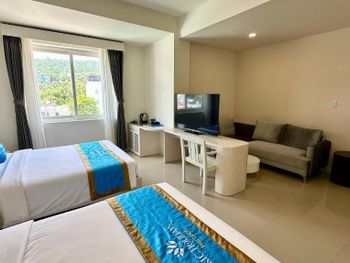 Не хватает сушилки для вещей. В ванной есть полка, куда можно повесить полотенца, а мокрые вещи после моря больше некуда повесить. На моем этаже жила большая группа туристов кажется из Китая. С раннего утра они очень громко разговаривали в коридоре, хлопали дверьми, ходили туда-сюда. Ощущение было, что в общежитии живешь. Это не вина отеля, но можно попробовать повесить объявление, что соблюдайте тишину хотя бы до 8 утра.