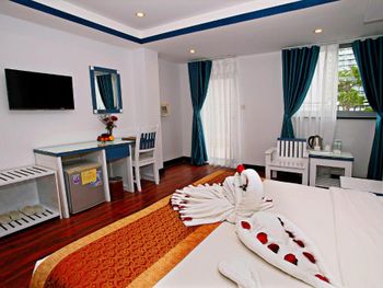 Бронировали на 6 ночей через Букинг без предоплаты. Двухместный улучшенный номер Делюкс с видом на море. 32 кв, м. Отель сразу ответил на все вопросы. Переписка была на русском языке. Выполнили все наши предпочтения - две кровати в номере, высокий этаж. Очень выручал балкон . Все быстро сохнет. Нет сушки, но мы натянули шнур и прекрасно обходились. Платили по прибытии картой. Оказалось, что при оплате картой будет дороже на 3%, в нашем случае переплата была 300 рублей. Нас это устроило. Цена - качество соответствует. Завтраки превзошли наши ожидания. Мы с мужем любим азиатскую еду. Всегда есть Суп Фо Бо, с курицей или говядиной. Кари очень вкусный, также чередуют в нем курицу, говядину, свинину. Зелень, салат, соусы. Рис с овощами, картофель жаренный, печень с овощами, обжаренная лапша с овощами, омлет. Голодным точно не будете. Из фруктов или арбуз, или бананы. Кофе, сгущенка, рисовые блинчики, кексы, всегда есть напиток со льдом, правда без выбора, но каждый день разный. Готовят вкусно. Чисто. В номере уборка каждый день, со сменой полотенец. Постель меняют раз в неделю. Естьстол для работы и чайный уголок с двумя креслами и столиком. Очень удобно. Нам все понравилось. До моря 5 минут, причем переход дороги не такой стрессовый как у Лотоса. Рядом куча магазинов. Маленький но достаточно глубокий бассейн на крыше 1,6 м, работает до 22-х. Есть лежаки. Мы продлили свое пребывание здесь еще на месяц. Не пожалели. Продляли на ресепшен, а не через Букинг. Получили скидку. 😊 рекомендуем. Выше писали, что нет чая. Видимо учли и теперь чай есть! 😊