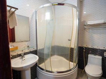 Дверцы шкафа сильно скрипели. Ящики плохо выдвигались.Поэтому вещи из чемоданов даже не выкладывали.Вековая пыль на бра и настенном вентиляторе.В ванной комнате нет герметизации между стеной и душевой кабиной.Не спасали даже положенные персоналом вокруг кабины полотенца.После приема душа приходилось убирать с пола воду.Сантехника старая.Все железные конструкции (вешалки, держатели и т.д.) покрыты ржавчиной.В душевой кабине нет полочки под банные принадлежности.Заехав в номер, обнаружили,что на кровати не поменяли белье.Предъявили претензию охраннику, т.к. в поздний час никого больше не было.Белье он принес, меняли сами.Для нас были скудноваты завтраки.Ели, в основном, только яичницу.
