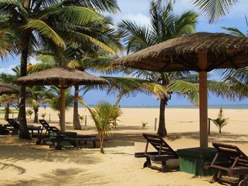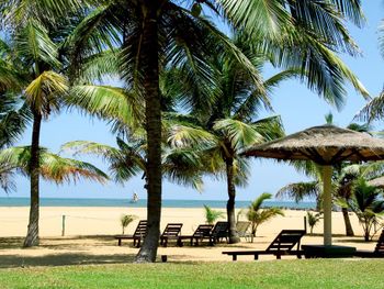 Прекрасная площадка в пальмах для загара недалеко от океана.