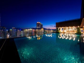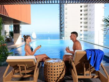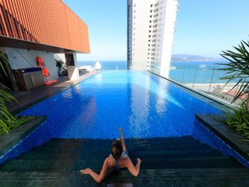 Бассейн на крыше просторный, вода чистая, есть лежаки, а рядом с бассейном есть бар, где можно заказать напиток.