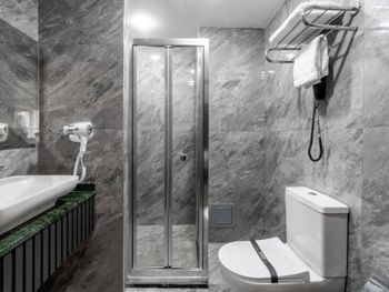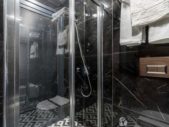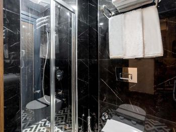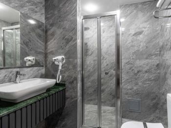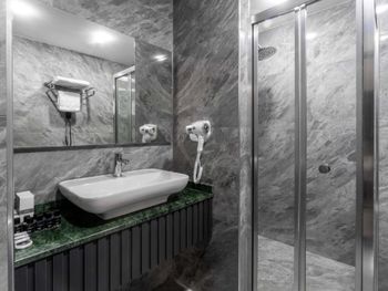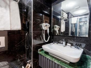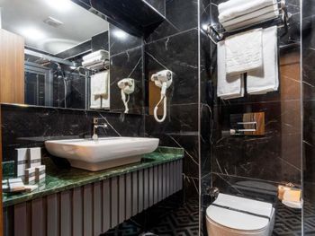 Местоположение отеля хорошее — рядом находятся метро, трамвайные и автобусные остановки, что очень удобно для передвижения по городу. Дизайн и состояние номера вполне новые и свежие, особенно порадовало наличие стандартных удобств, таких как шампунь, мыло и гель для душа. Хотя размер бутылочек был маленьким, общее впечатление от ванной комнаты положительное.