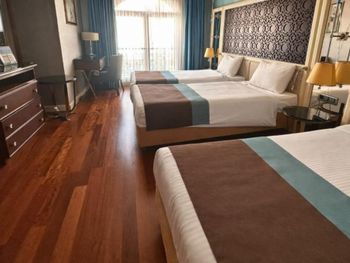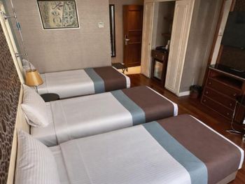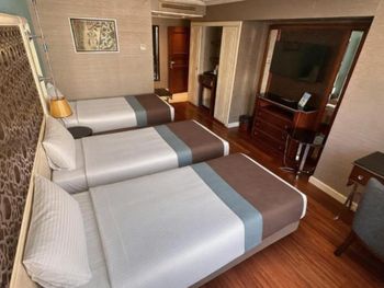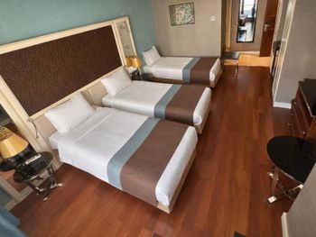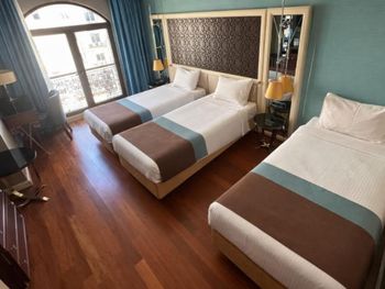 Не верьте описанию размеров номеров и размеров кроватей. Реально в стандарном номере для троих, который описан как 20кв.м, помещается только 3 кровати шириной около 80см и остается только место для прохода. Санузел занимает примерно 7кв.м из указанных 20. Представили? Завтрак подают в номер, видимо антиковидные меры. Но кушать негде... Номер мини. Бронировал Номер с 4 кроватями, но пришло подтверждение на 3-местный, не проверил - заплатил 10€ за дополнительное место и даже проходов в номере не осталось.