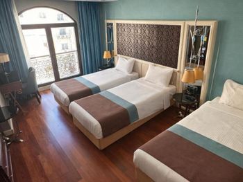 в целом гостиница потрёпанная и бывалая, но с остатками бывшей роскоши. Ее видимо на спех отреставрировали и не совсем качественно! в номерах нет люстр , только лишь торшеры, я так дум сделано это это чтобы я не было видно недочетов! углы ободранные, на ванне виден герметик неаккуратными слоями, есть сколы. На мягкой мебели пятна, которые скрыты приглушенным светом, но нужно отдать должное номер был чист и постельное тоже! очень скудный завтрак! ходил только в первый день, потом решил что он не стоит того чтобы просыпаться раньше! была не приятная история с ТРАНСФОРМЕРОМ! заключается она в следующем: Угораздила меня заранее узнать у них за трансфер с аеропорта! сказали без проблем машина на 2х человек -45€! думаю ну на всякий случай перестрахуюсь, да и в целом аеропорт находится далеко ( 40 мин без пробок, 1.5-2 ч с пробками), вот и заказал! потом еще несколько раз уточнил, машина нас будет ждать по прелету? уверели что да! поитогу что мы имеем под так называемым трансфером! на выходн из аеропорта вас встречает наглый малолетний турчонок, но встречает не только вас, а собирает и других клиентов! в итоге вы ждете мин 10, потом «группой» ведет через переход, оставляет всех перед дорогой и начинает подгонять всем машины по какой то очереди, в которой мы оказались где то в конце! поитогу через 20 минут мои нервы не выдержали, я подошел к Турчонку и спросил! Сэр, где наша машина сколько еще ждать? в итоге он заткнул мне рот выставив передо мной руку и продолжил говорить с каким то другим турком! Такой неглости и хамства не терплю, поэтому развернулся и тут же остановил первое попавшееся Желтое Такси, которых там полно! погрузили багаж и поехали! в итоге такси там много и не проблема, поездка вышла 25$, что почти в 2 раза больше чем так называемый «ТРАНСФЕР» вобщем с первых минут уже был осадок, а по приезду в гостиницу нас ждал консьерж которые набросился с обвинениями почему мы не дождались машину трансфера, что она уже оплачена и мы в любом случае обязаны ее оплатить!