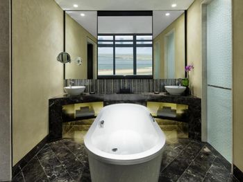 Отличный просторный номер, вид красивый, пляж и бассейн. Стильный дизайн. Много воды в номере. Есть ванна и соль к ней, кофе машина и сливки.