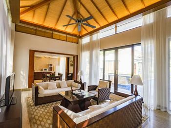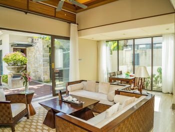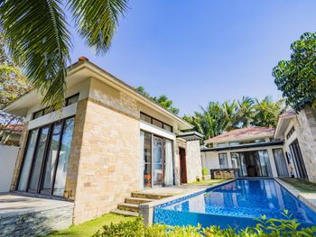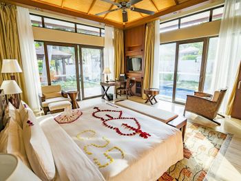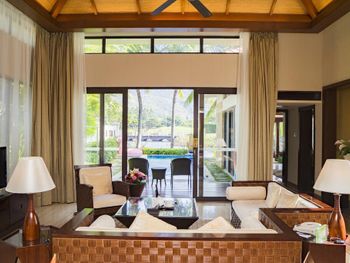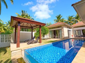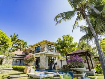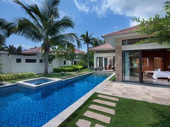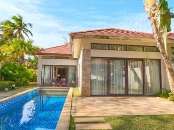 Большая зелёная территория, по территории и до пляжа возят гольфкары, собственный бассейн на вилле, работа персонала на ресепшен (высоко оценил).