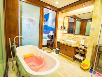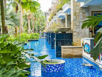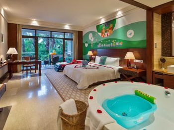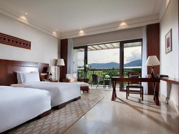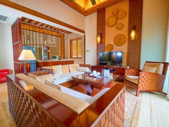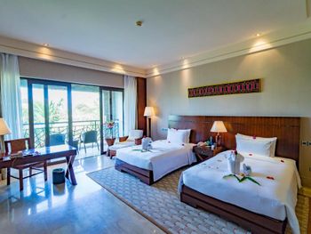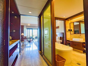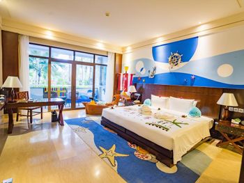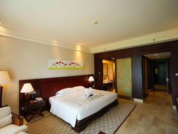 Жили на вилле. Меню в ресторанах ориентировано на клиентов из Китая только. Информация в отзывах об "шикарной кухне" не подтвердилась, выбор за завтраках и ужине очень скудный, поэтому ужинали в основном в других отелях. Отсутствие персонала, владеющего английским или русским языком. Общение с помощью переводческих приложений на смартфонах очень затруднительно. Персонал не доброжелательный. Примеры: Попросили открыть зонт от солнца возле бассейна - отказали и не позволили открыть самостоятельно, через десять минут подошли китайские туристы, для которых зонт был открыт незамедлительно. Вызов такси с помощью персонала в лобби практически не возможен под разными надуманными предлогами. Заявленный отелем бесплатный трансфер из/в аэропорт не возможен, сделали вид, что не понимают нас. Уборка в номерах символическая, без влажной уборки, плюс через раз забывали положить питьевую воду и прочие принадлежности. Мягкие коврики в комнатах выглядят очень "уставшими", требующими замены. При посещении других отелей, для ужинов (Шератон, Мариотт, Хуалюкс, Пульман), получали очень доброжелательное отношение со стороны персонала, в том числе возможность общения на английском и вызова такси без проблем.