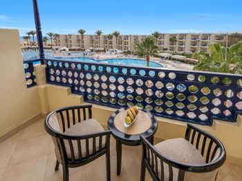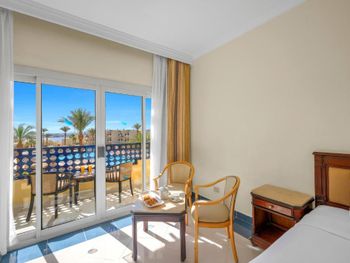 Мы находились в отеле часов 9, причем не ночевали. Номер очень симпатичный с видом на бассейн и море, в комнате были 2 большие кровати с удобной подушкой, что для меня очень важно, т.к. я постоянно таскаю с собой свою подушку. Но к сожалению ночевать не пришлось, у нас был ночной вылет. . Риф Оазис избаловал нас и питанием, так что с тем питание даже не сравнимо, хотя есть выбор и блюд и овощей и фруктов, и вина, и кофе. Персонал доброжелательный, заселили быстро и в хороший номер, охранник помог вызвать такси для отъезда в аэропорт. Возможно выход балкона на бассейн и имеет минусы в плане шума, но нам повезло, так как прямо с балкона удалось посмотреть "огненное шоу", представление было замечательным.