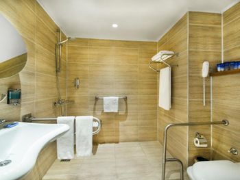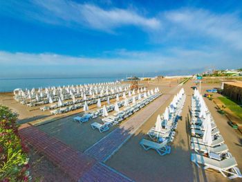 При заселении и выселении не было помощи персонала с чемоданами. В сезон все лежаки забиты, занимать нужно с раннего утра, в столовой так же - очереди и отсутствие свободных столиков. В бассейне все забито людьми. Заселили в номер с пустым баром, обещали пополнить, но в течение 3 дней так никто и не принес напитки. Пляж находится в 15-20 мин ходьбы от отеля. "Так называемый" трансфер до пляжа - это 7 местная открытая машинка, в которую не попасть, так как народа очень много, приходилось ходить пешком. В море были большие волны и стаи мелких кусачих рыб, которые не давали нормально плавать, многие люди выходили с моря с искусанными до крови ногами, мед помощи на пляже нет, обрабатывали раны спиртными напитками...